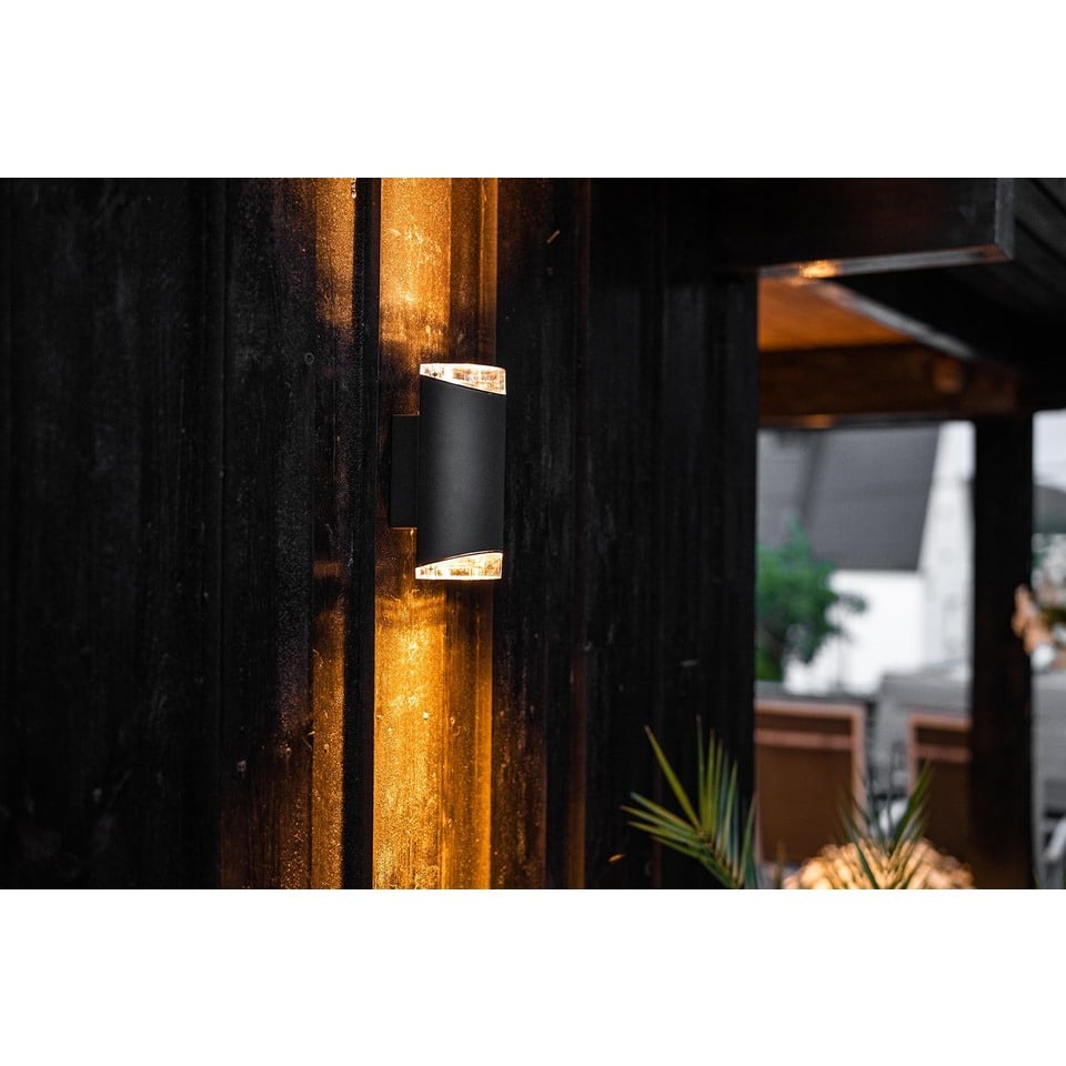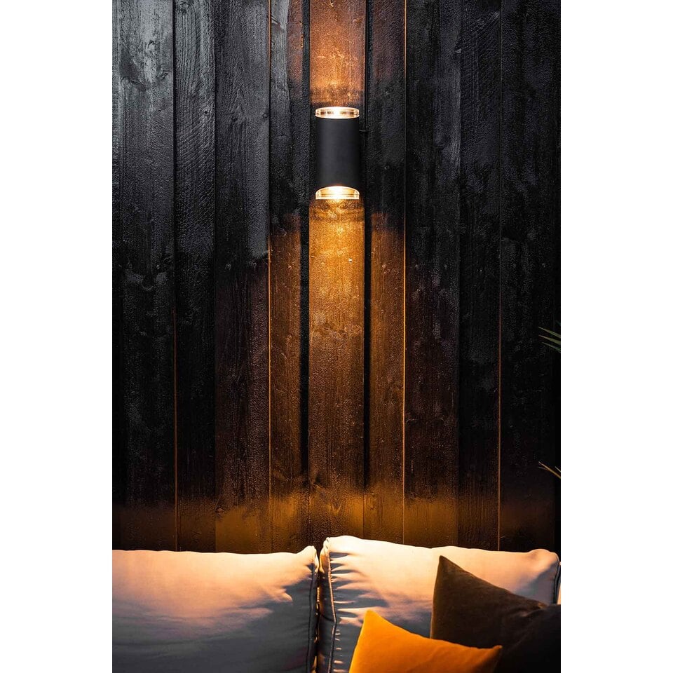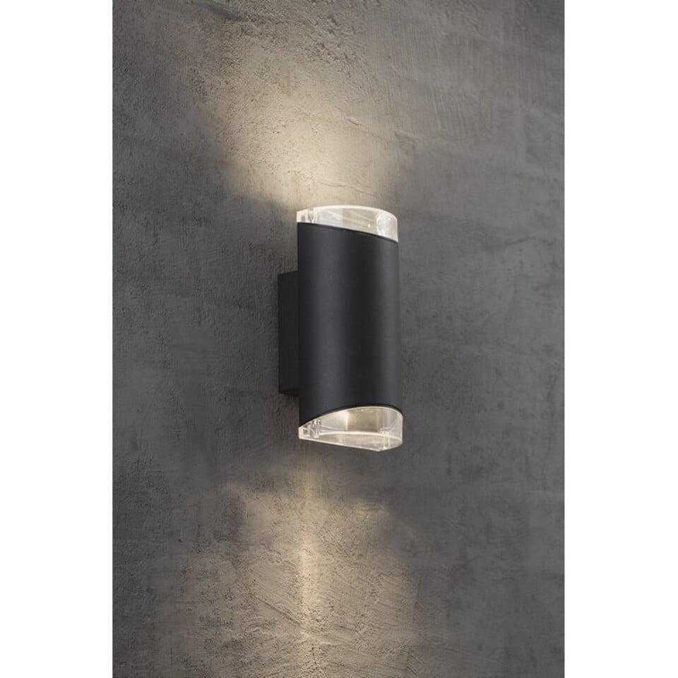 Moby vegglampe dobbel lyser effektfullt opp fasader med sine oppadgående og nedadgående stråler. Denne lampen kan med fordel brukes ved inngangspartier. Lyset vil være synlig på god avstand, og det elegante uttrykket vil bidra til å løfte helhetsinntrykket av fasaden. Lampen er laget i sort aluminium og PCA, og har GU10 sokkel. Leveres uten lyskilde.