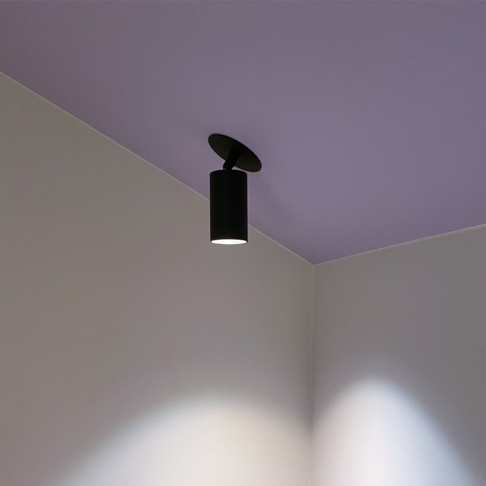 Pluto takspot i matt sort utførelse med GU10 sokkel og inntrukken lyskilde. Lampen er en type utenpåliggende downlight som kan roteres 360° og tiltes 70°. Spotten egner seg svært godt til å belyse malerier eller andre elementer man måtte ønske å fremheve. Fås også i matt hvit utførelse. Leveres uten lyskilde.
